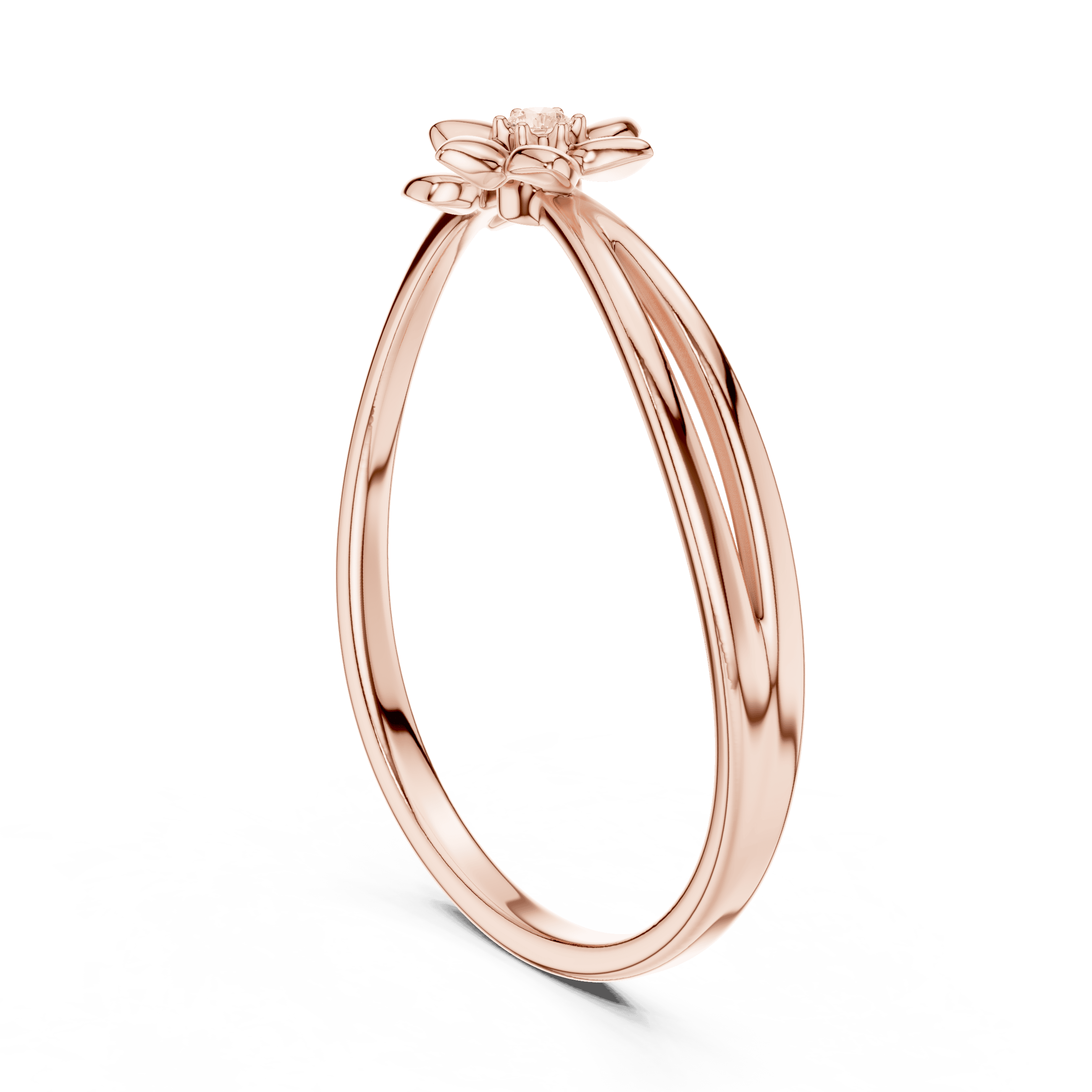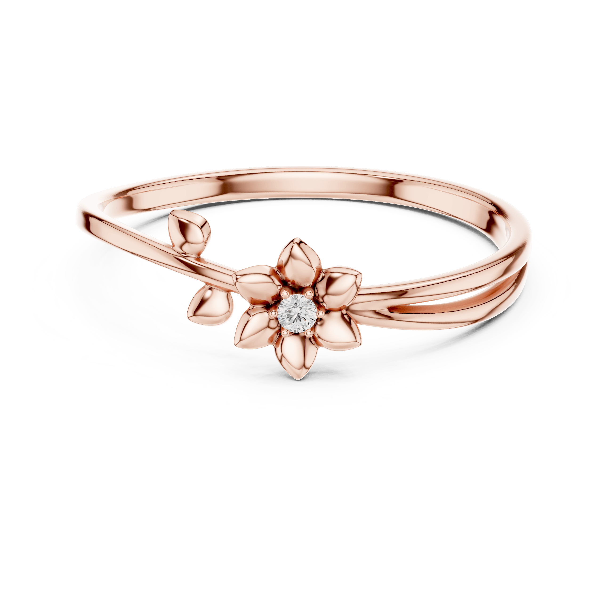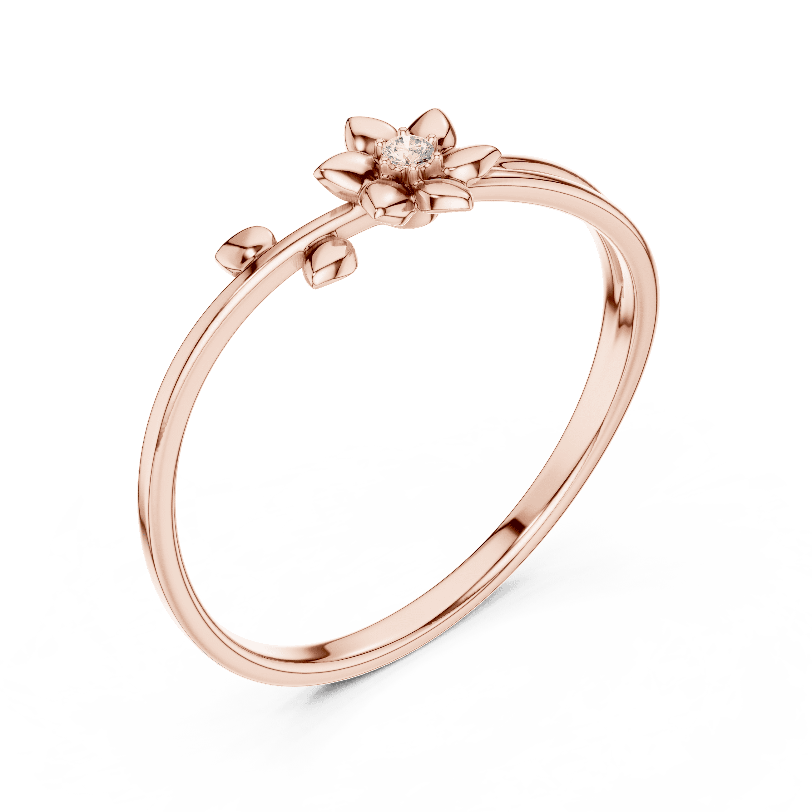 At the heart of the ring lies a single round brilliant lab-grown Laboratory-grown Diamond, carefully selected and delicately proportioned to complement the floral-inspired form rather than dominate it. Measuring 1.35 mm with a total Laboratory-grown Diamond weight of 0.011 carats, the Laboratory-grown Diamond is secured in a fine collet setting, allowing light to enter gently while maintaining a clean, seamless silhouette. The result is a restrained sparkle—subtle, elegant, and unmistakably refined.