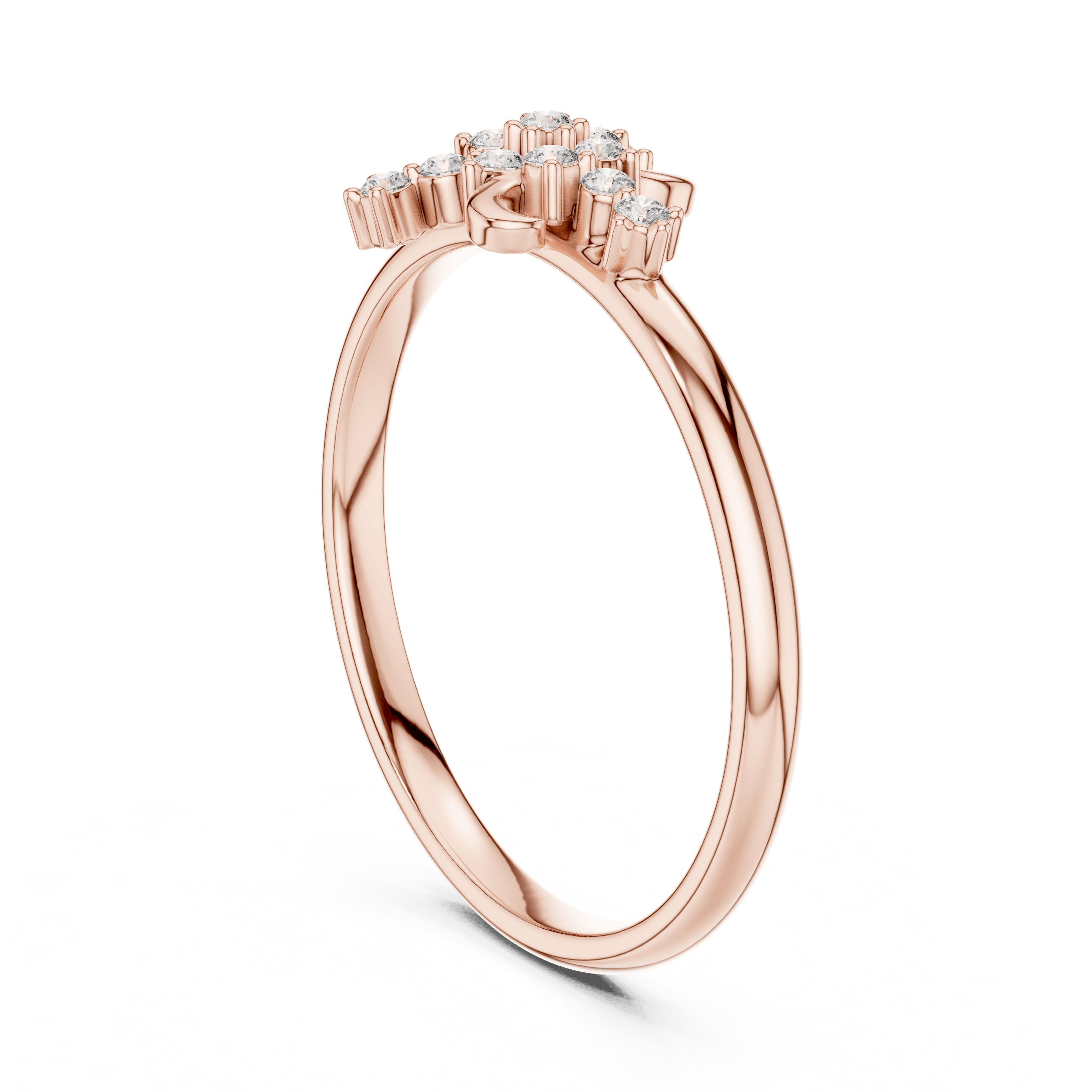 As per the CAD specifications, the ring is adorned with 13 round brilliant laboratory grown diamonds, thoughtfully arranged to maximize sparkle while maintaining a light and balanced profile. The diamond composition includes twelve diamonds of 1.10 mm and one diamond of 0.80 mm, with a total diamond weight of 0.078 carat. All diamonds are securely set using collet setting, ensuring durability, comfort, and enhanced brilliance.