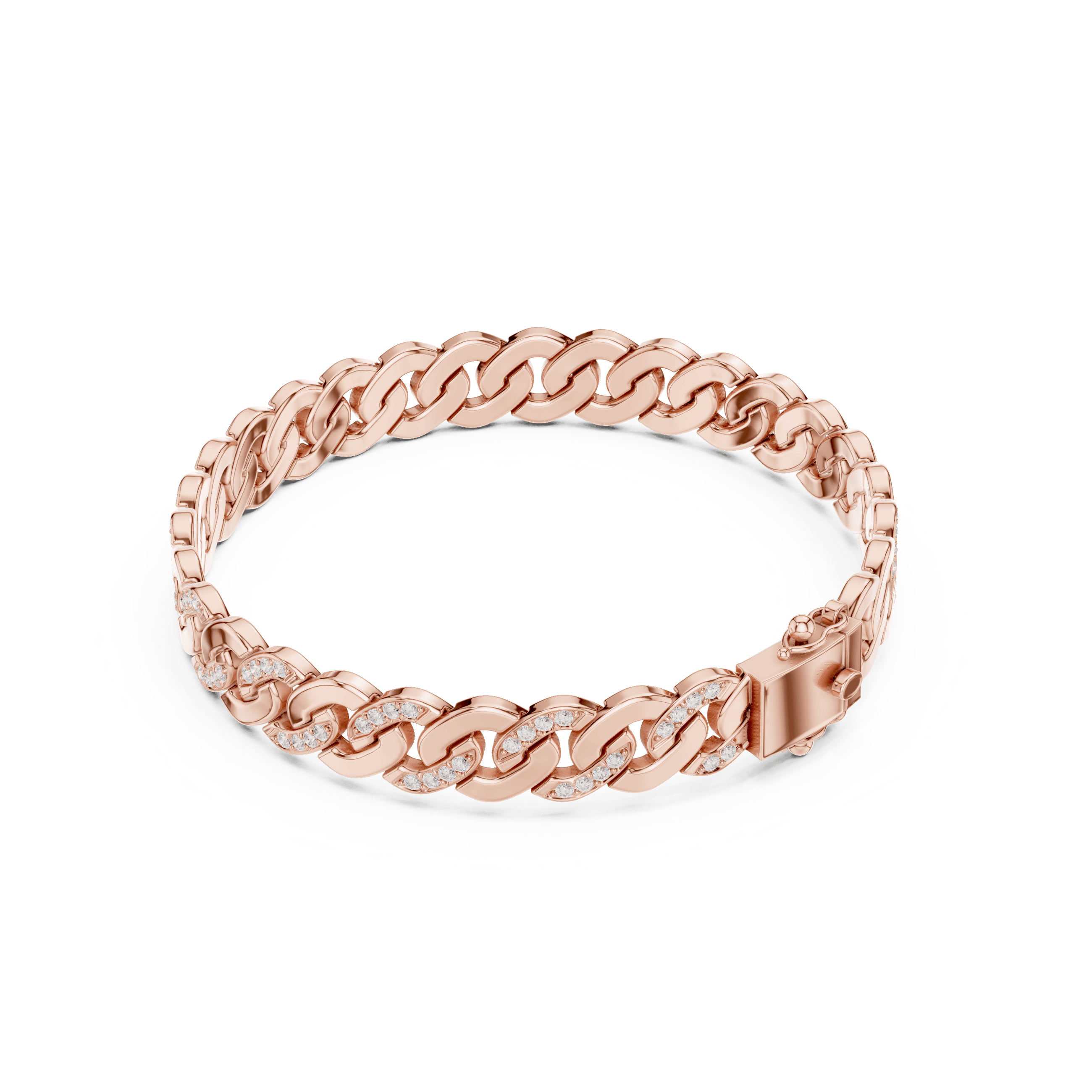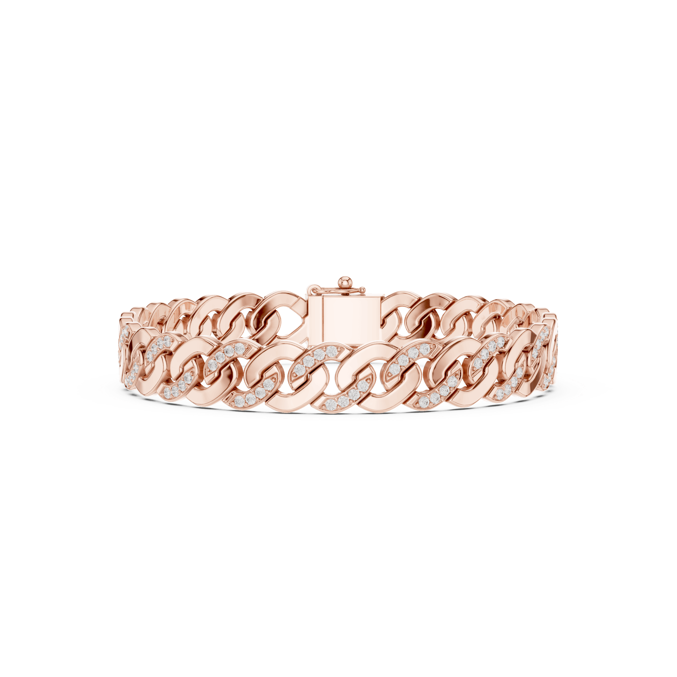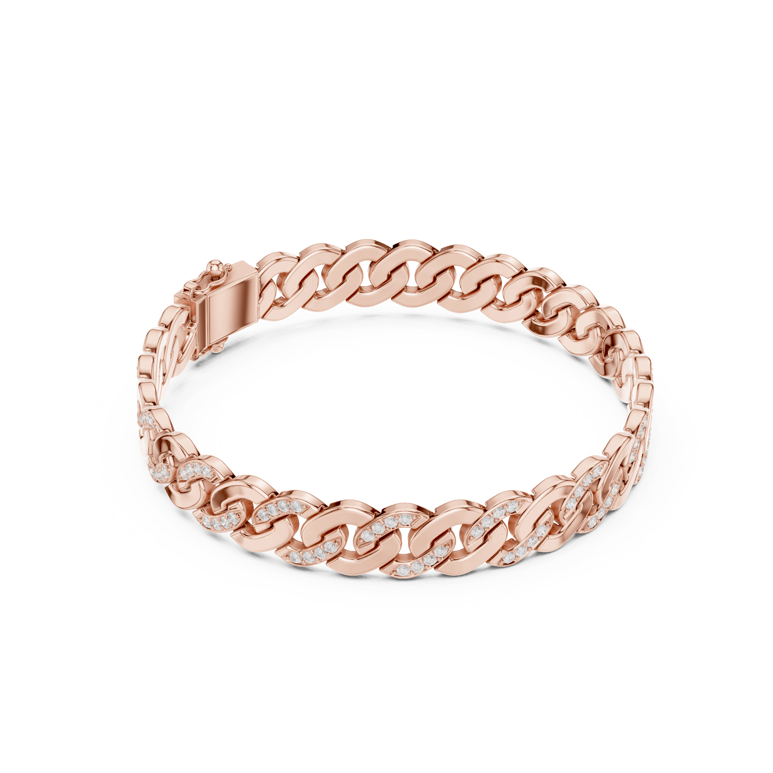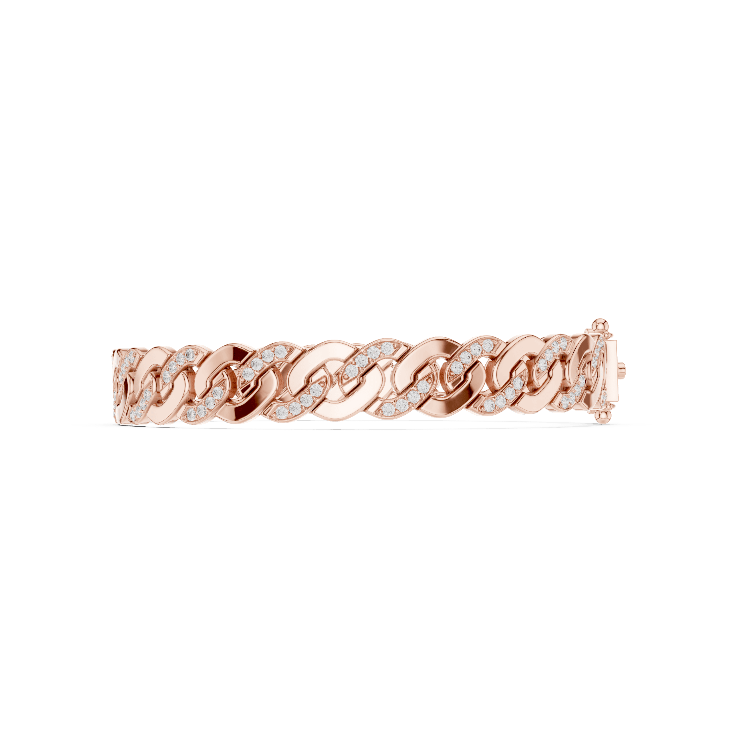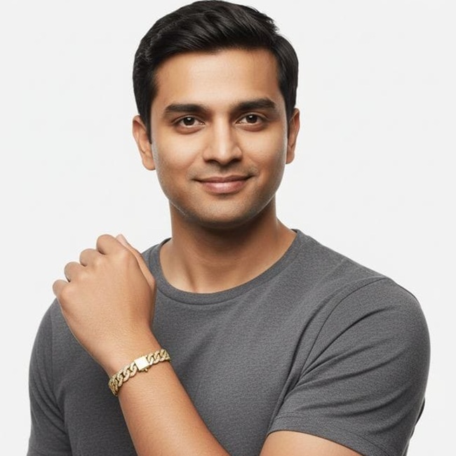 Suvarnarekha Ananta is conceived as a statement of uninterrupted authority, where form, weight, and brilliance move in perfect continuity around the wrist. Crafted as a fluid chain of sculpted links, the bracelet carries a commanding presence in solid gold, with an approximate weight of 24.58 grams in 18K (also available across higher purities), giving it a substantial, heirloom-grade feel the moment it is worn. Each link is meticulously pavé-set with 110 round brilliant diamonds, each measuring 1.30 mm, collectively delivering approximately 1.10 carats of refined sparkle that runs like a quiet current through the structure. The diamonds are embedded seamlessly into the gold, not to overpower the form, but to elevate it — creating a restrained luminosity that reveals itself with movement rather than display. The precision pavé setting ensures the stones sit low and secure, allowing the bracelet to feel smooth, architectural, and confidently masculine. Suvarnarekha Ananta is not ornamental excess; it is disciplined luxury — a modern heirloom rooted in Asian philosophy, designed for those who value permanence, lineage, and silent dominance over fleeting trends.