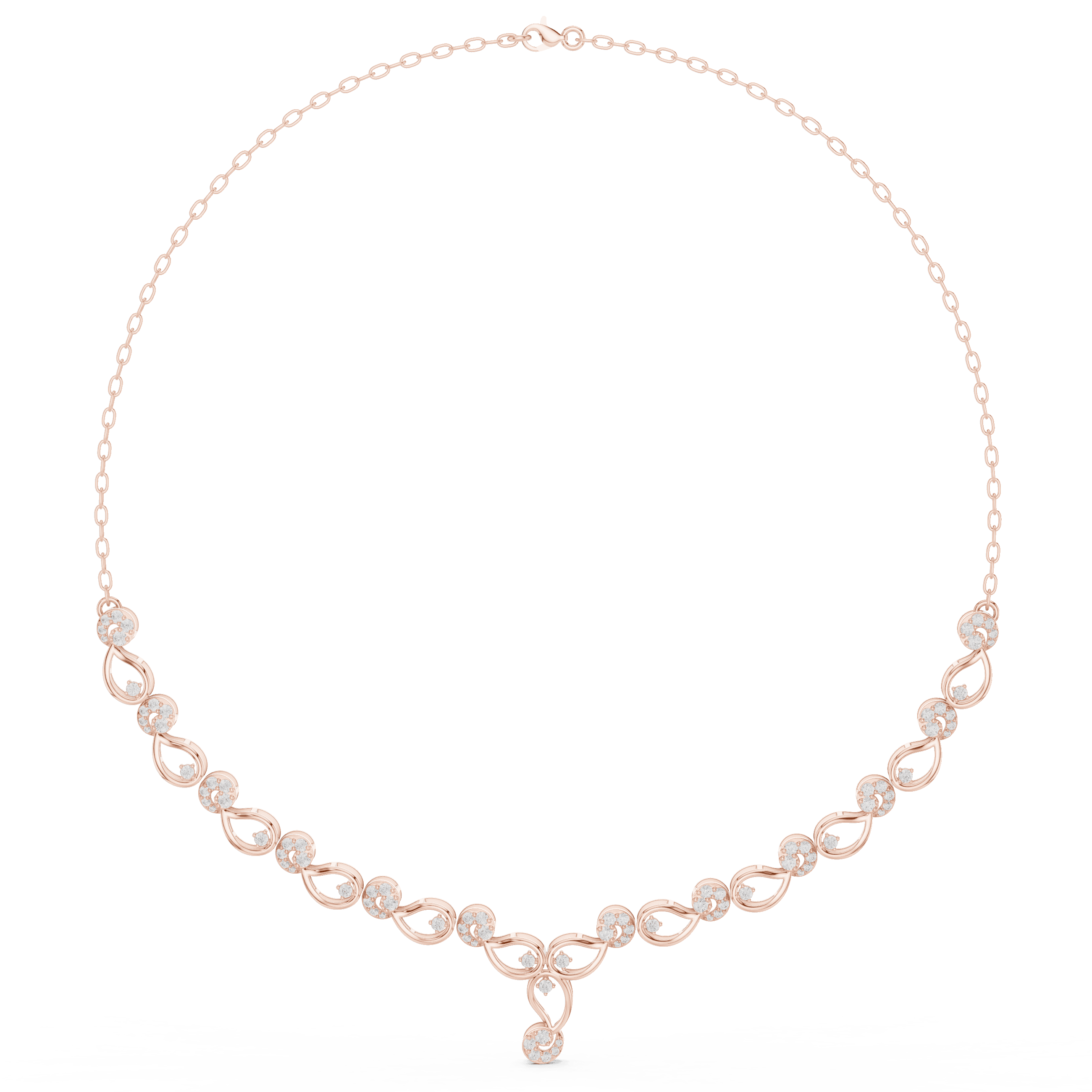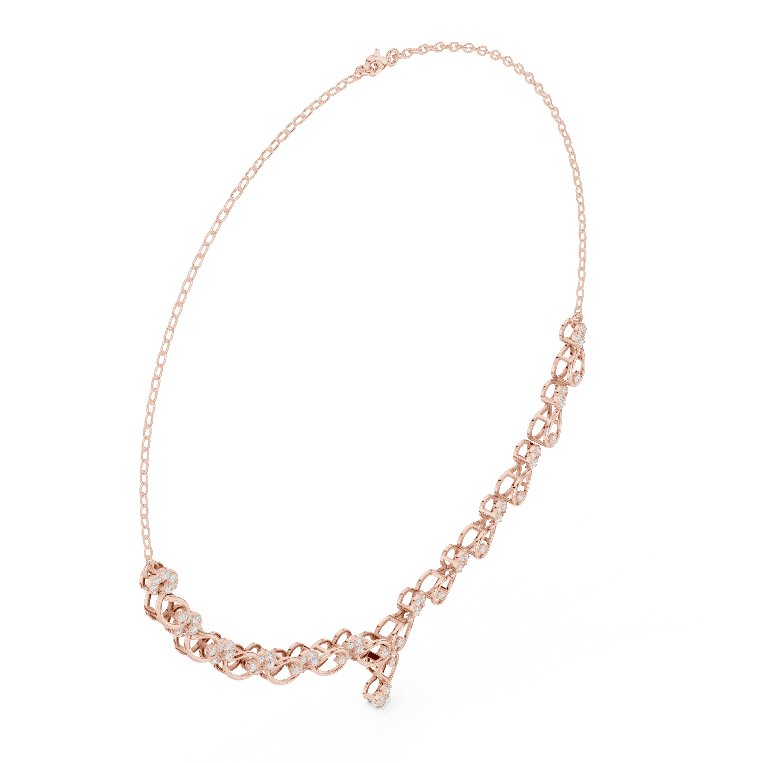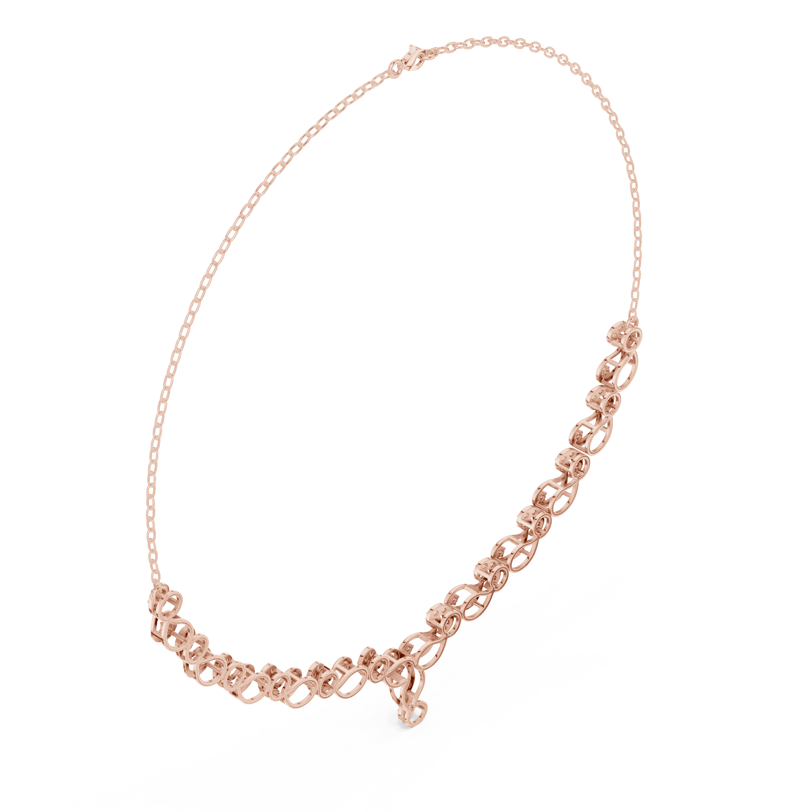Crafted in 10K gold as standard, the design features a fluid sequence of sculpted open curves accented with laboratory grown round brilliant diamonds, culminating in a refined central drop. The silhouette balances delicacy and presence, making it equally compelling for everyday luxury and elevated occasions. The rose-gold tone adds warmth while allowing the laboratory grown diamonds to remain the focal point through controlled sparkle rather than excess brilliance.