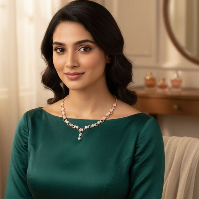 Iravya is derived from Sanskrit, meaning grace in motion — a form that flows naturally, without force. This necklace is designed around that philosophy, where soft curves and calibrated brilliance move seamlessly along the neckline, creating an effortless statement that feels modern yet timeless.