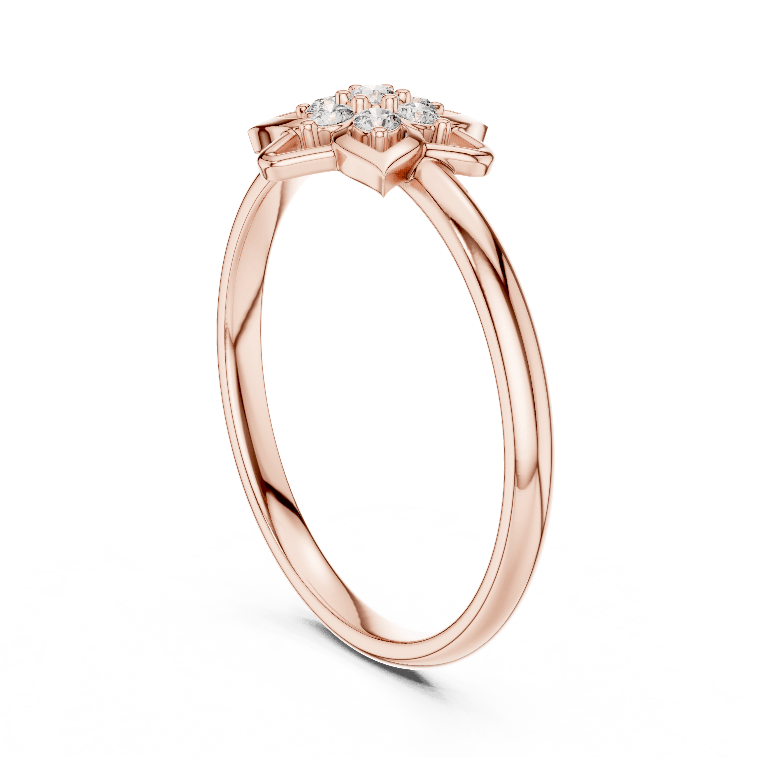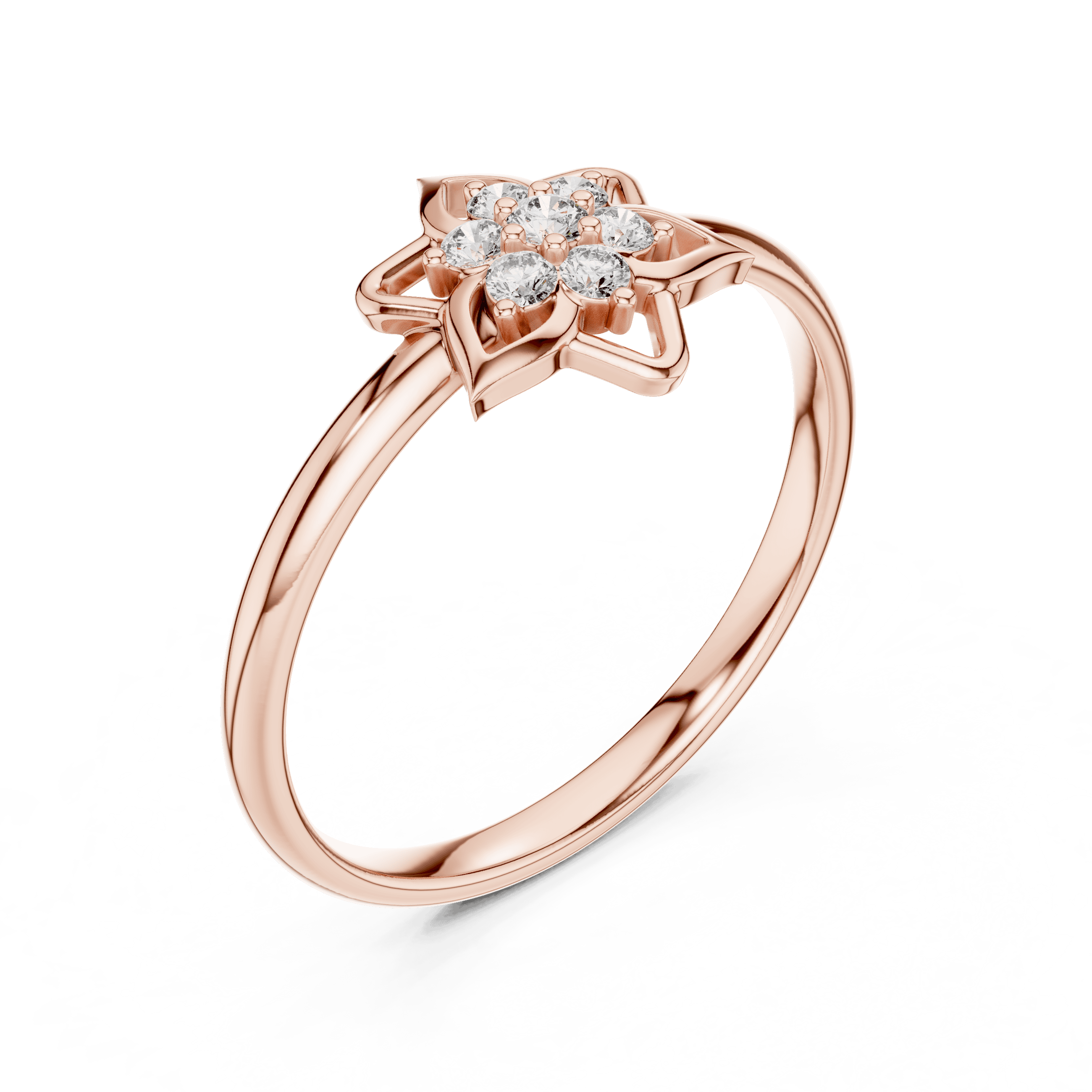 This ring is set with 7 round brilliant laboratory grown diamonds, thoughtfully arranged to create a radiant bloom effect. The diamond composition includes 6 diamonds of 1.30 mm and 1 diamond of 1.50 mm, with a total diamond weight of 0.08 carat. All laboratory grown diamonds are secured in collet settings, offering excellent brilliance, durability, and a smooth, comfortable profile.