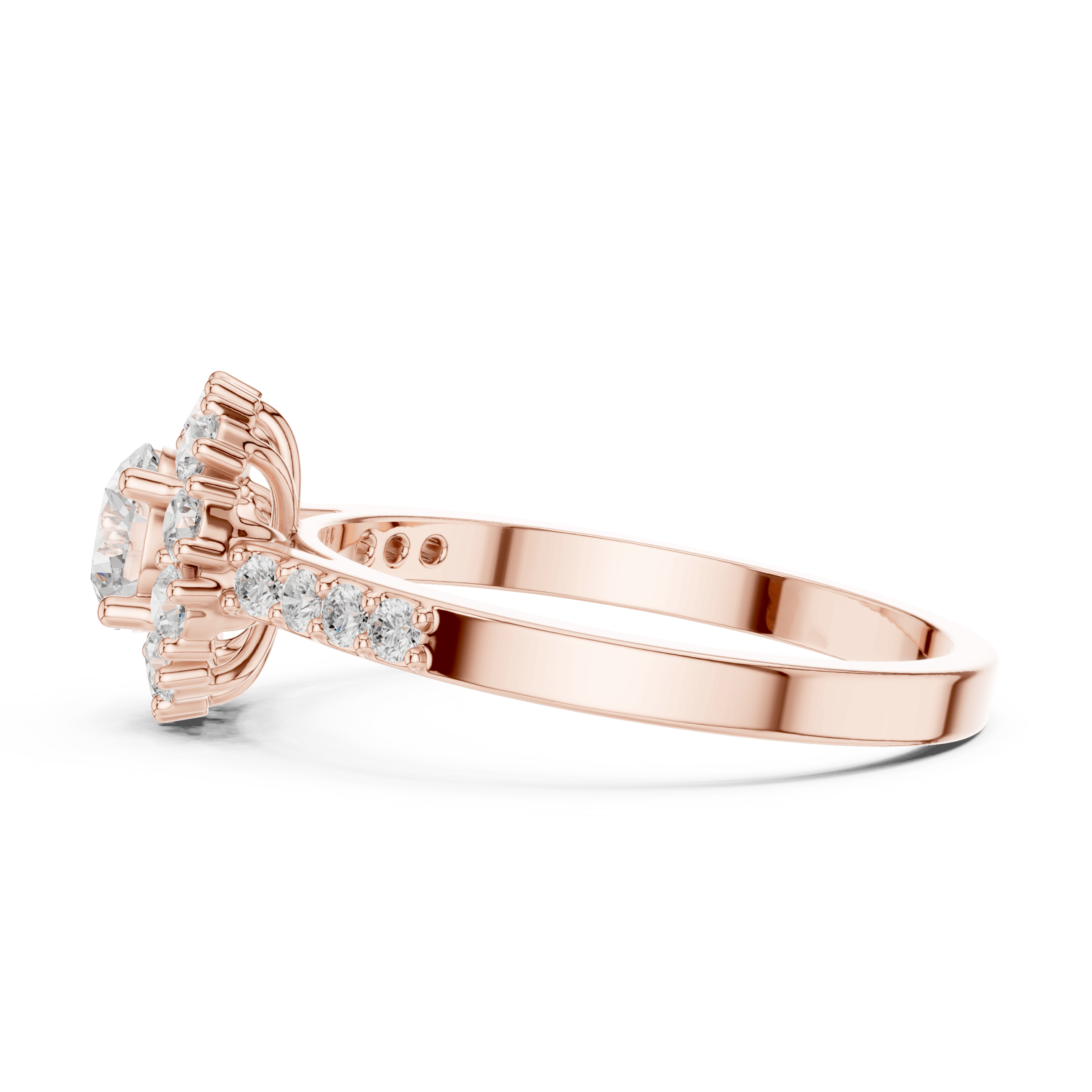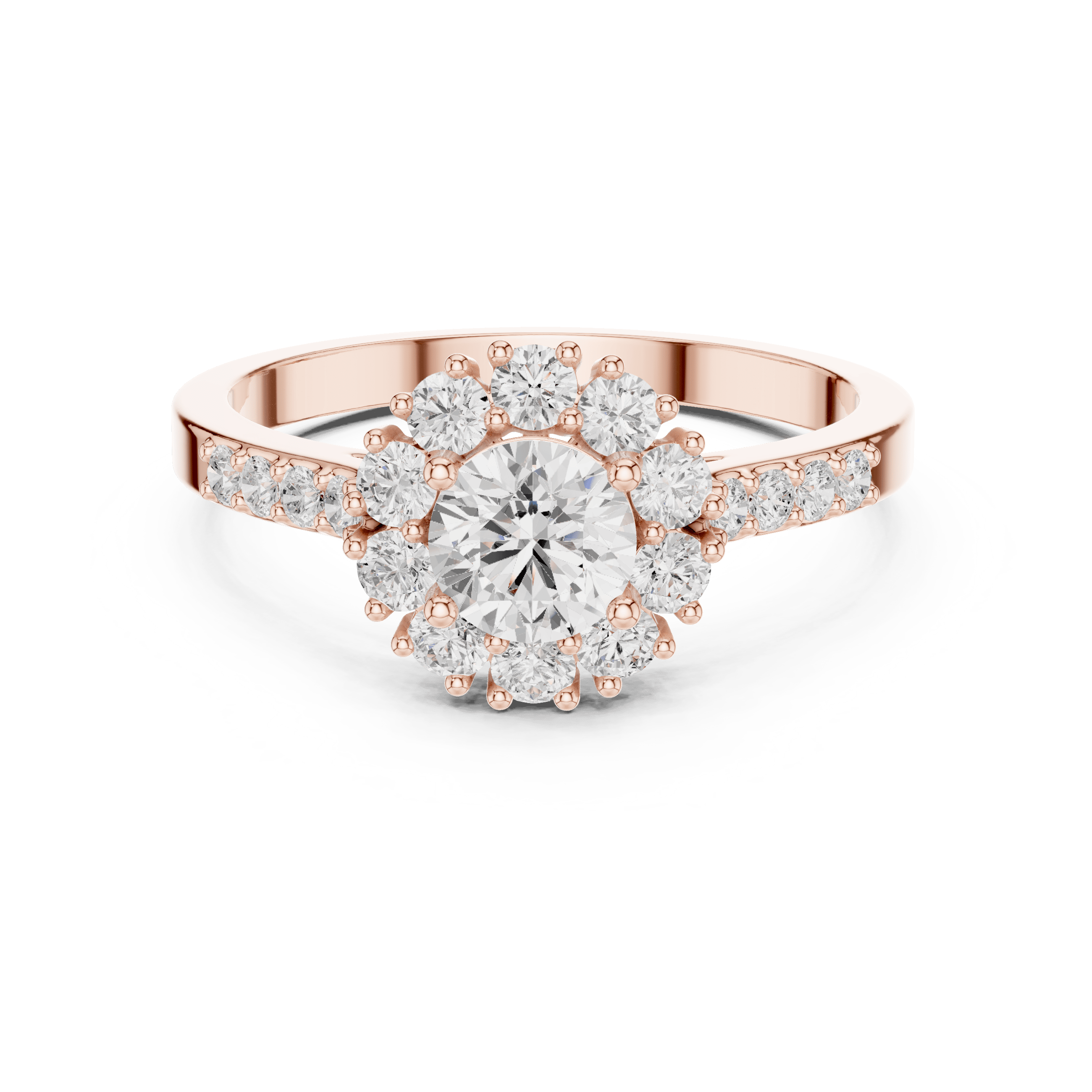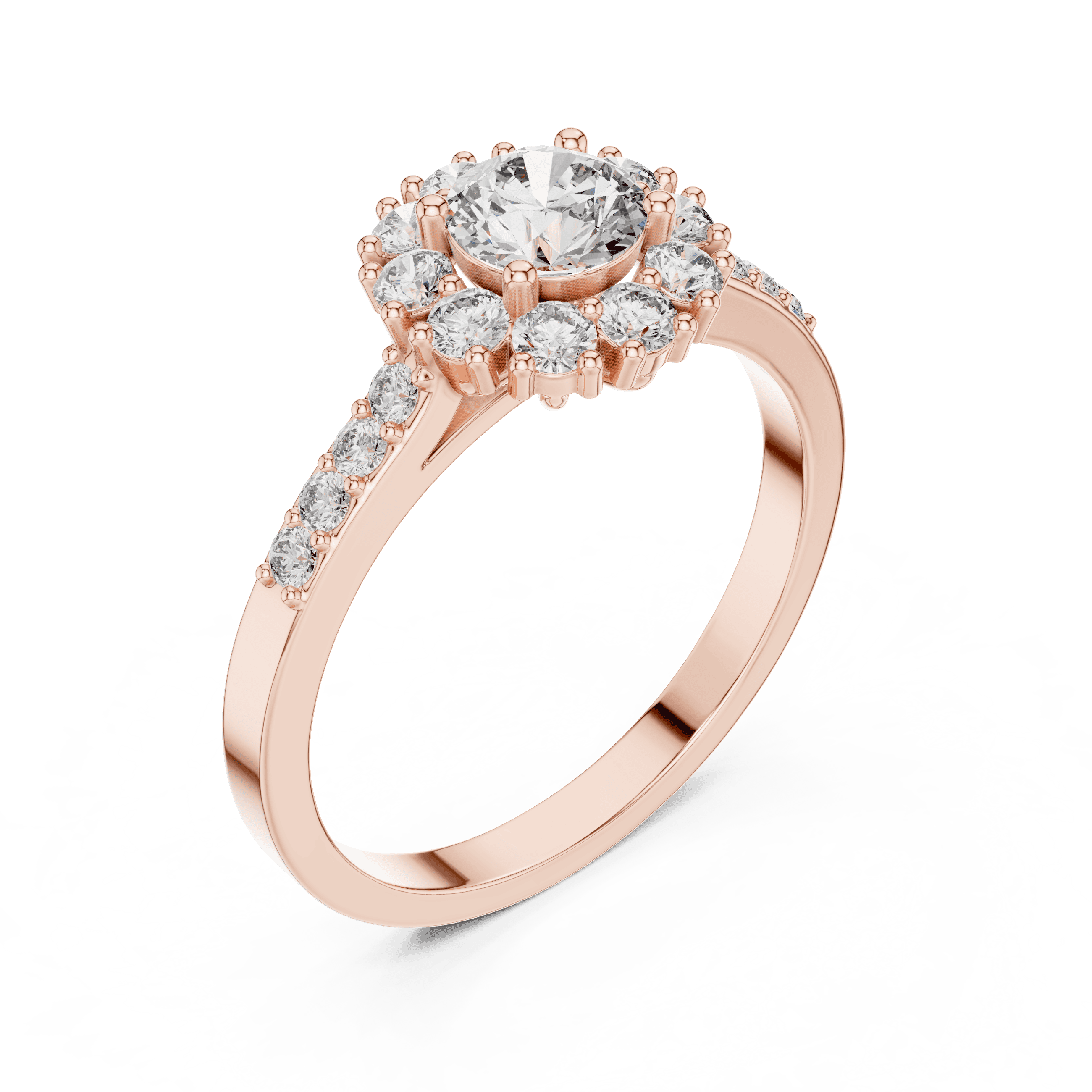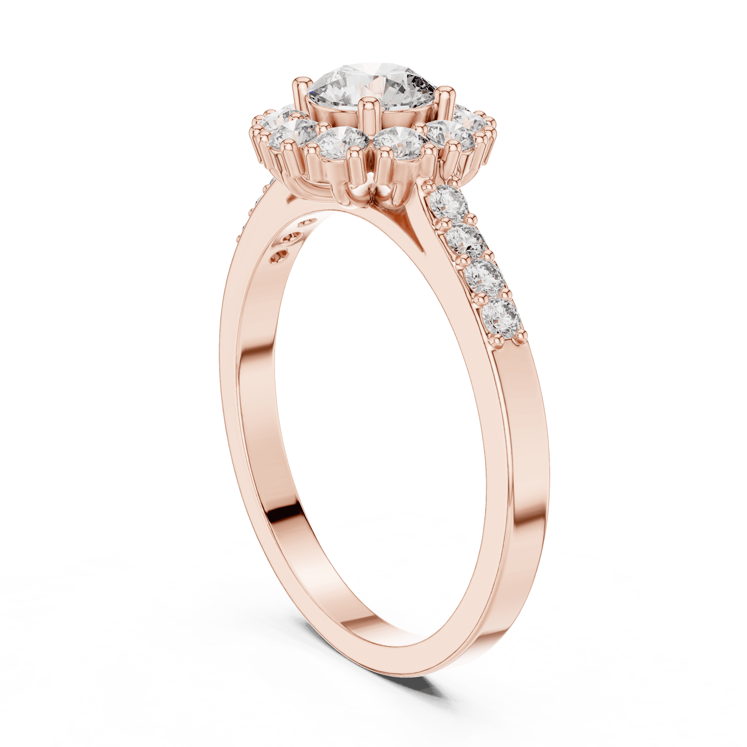 As per the CAD design, this ring is crafted entirely with laboratory grown diamonds, showcasing a harmonious blend of round brilliant cuts. At the center sits one round brilliant laboratory grown diamond measuring 5.00 mm, with an approximate weight of 0.50 carat, secured in a refined collet setting that enhances brilliance while maintaining a smooth, contemporary profile. Surrounding the center are 10 round brilliant laboratory grown diamonds of 2.00 mm size, contributing 0.350 carat, forming a glowing halo that amplifies depth and light. Further enhancing the design, 8 round brilliant laboratory grown diamonds of 1.50 mm size are delicately set along the shoulders in a prong setting, adding 0.120 carat of subtle sparkle. In total, the ring features 19 round brilliant laboratory grown diamonds with a combined diamond weight of approximately 0.97 carat, delivering balanced brilliance without excess.