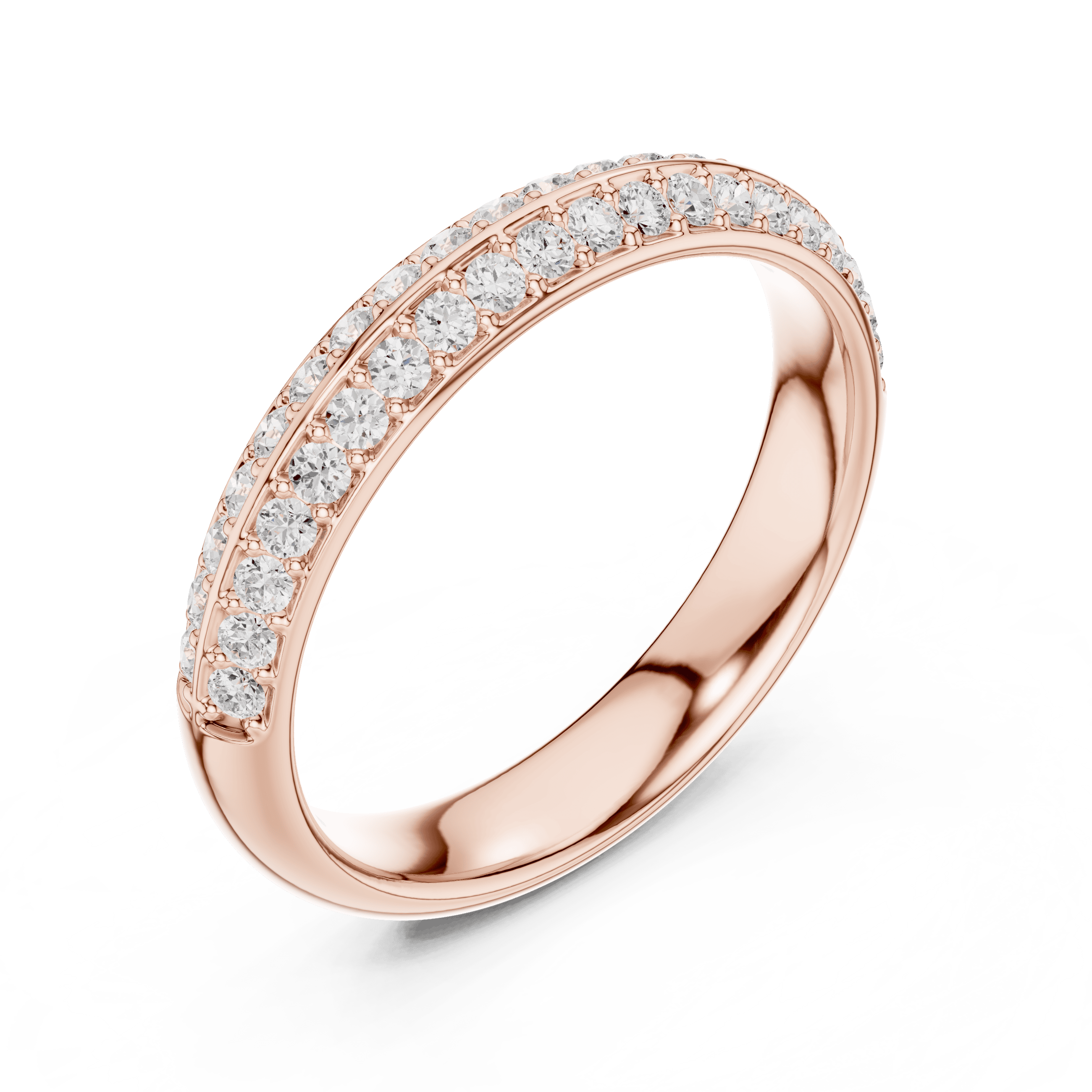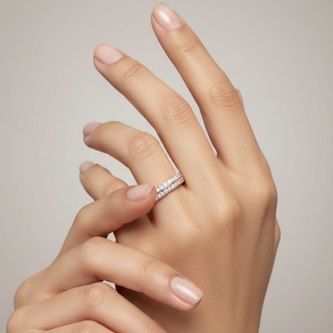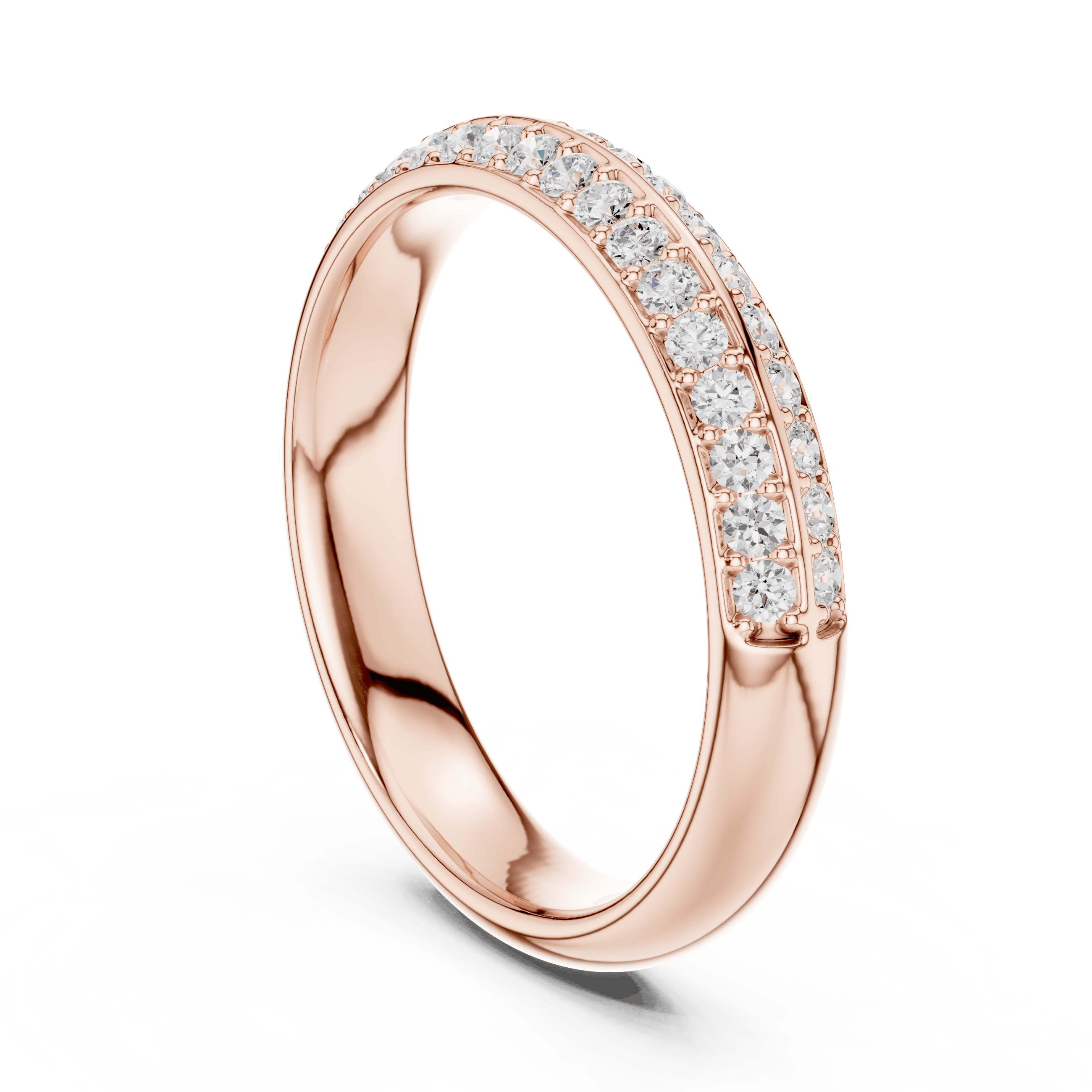 The design features round lab-grown diamonds set seamlessly along the band in a precise prong setting, creating a continuous line of sparkle with a clean, architectural finish. The closely set diamonds enhance light reflection while maintaining a smooth, refined profile, making the ring ideal for daily wear, stacking, or wearing solo as a signature piece.