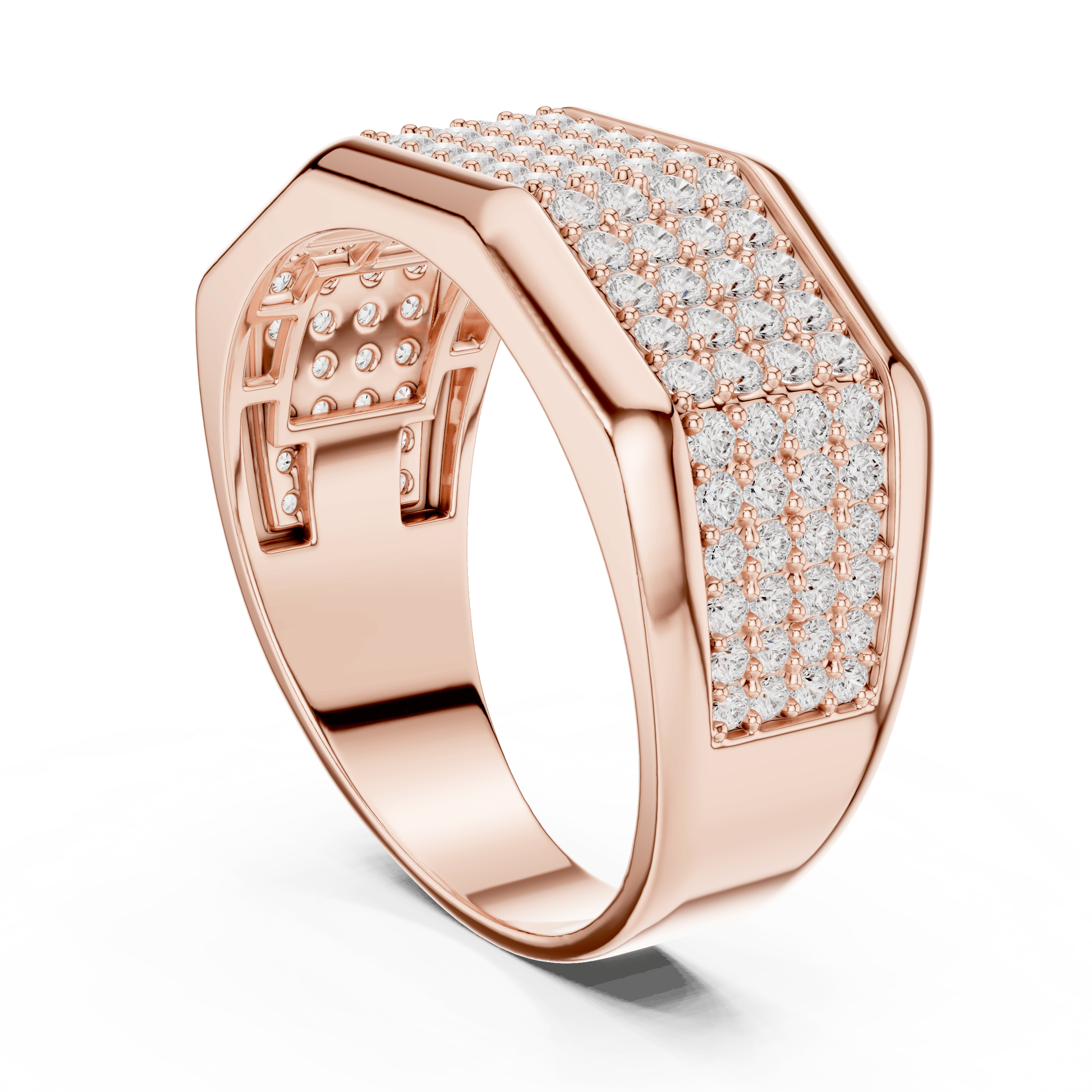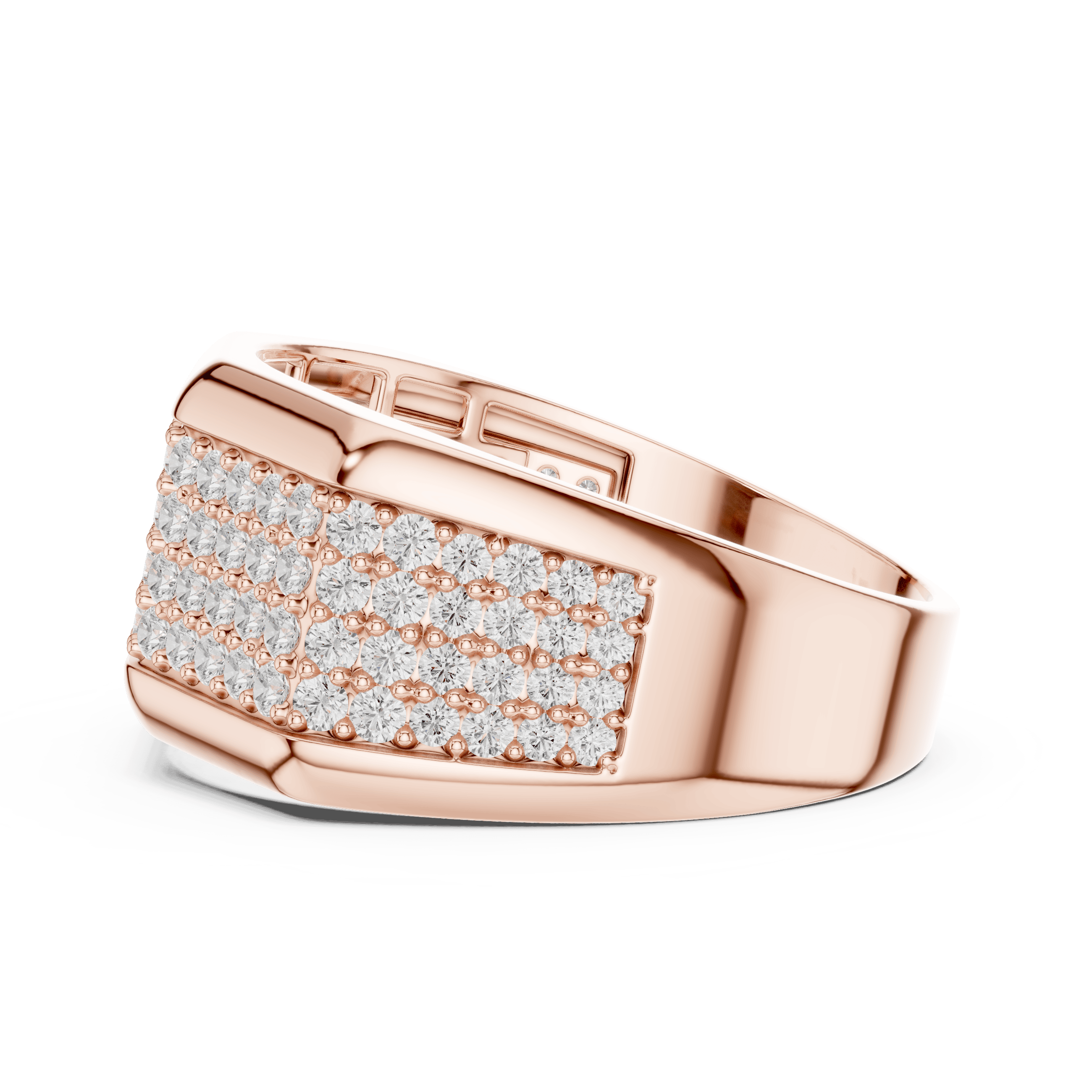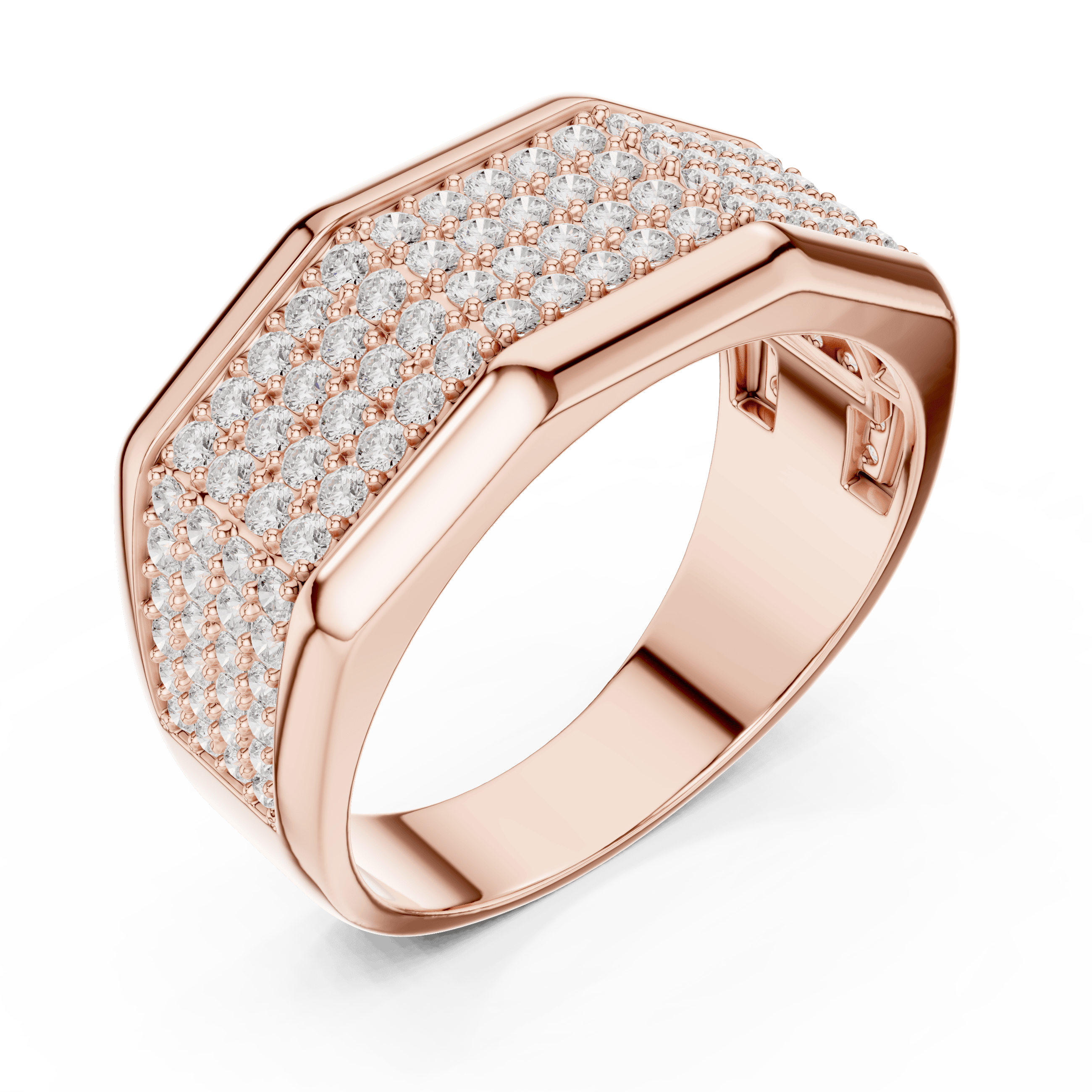 The top surface of the ring is set with 108 round lab-grown diamonds, carefully arranged in multiple rows to produce a dense pavé effect that maximizes brilliance from every viewing angle. Each diamond is secured in a precision micro-prong style setting, ensuring durability while allowing optimal light reflection for an intense and continuous sparkle.