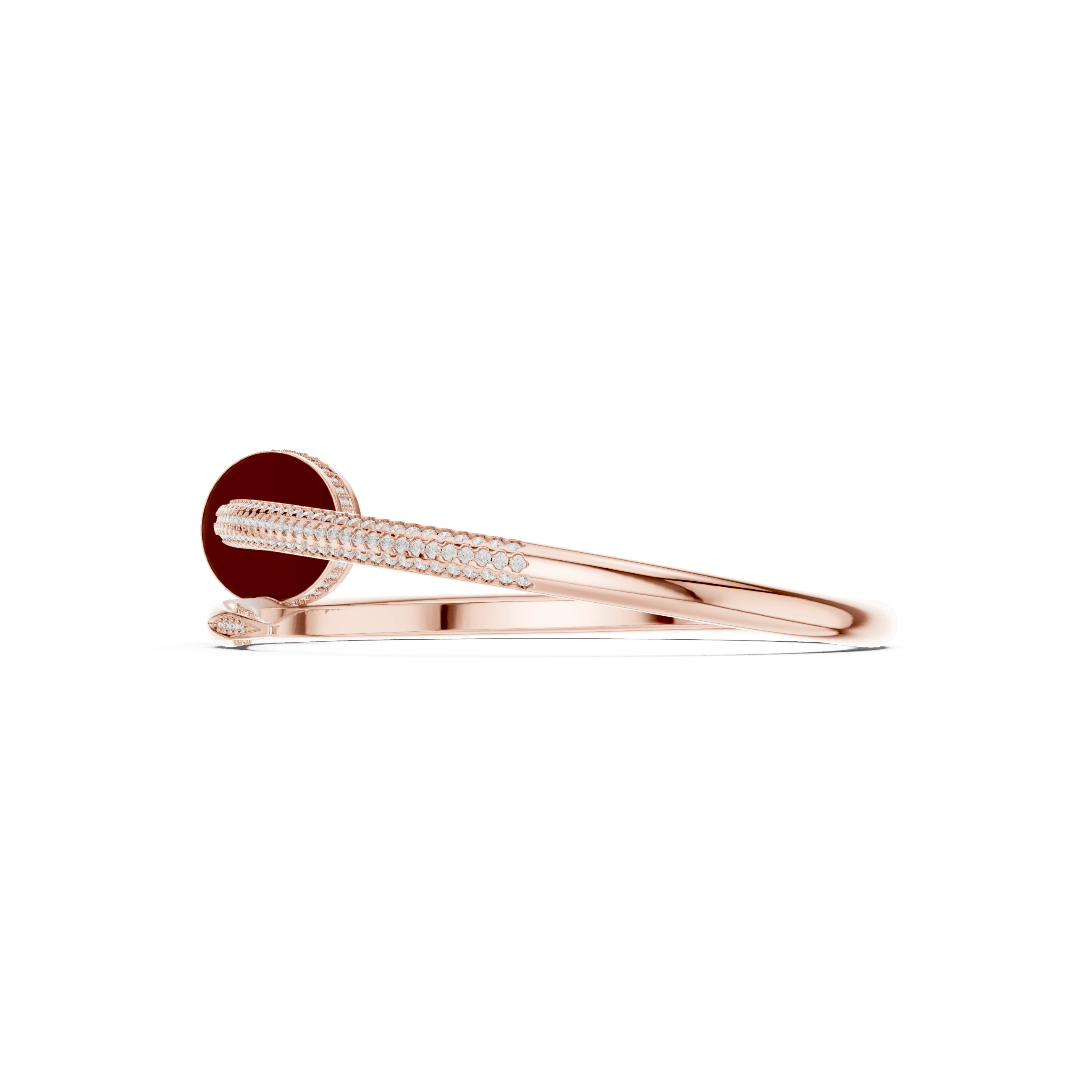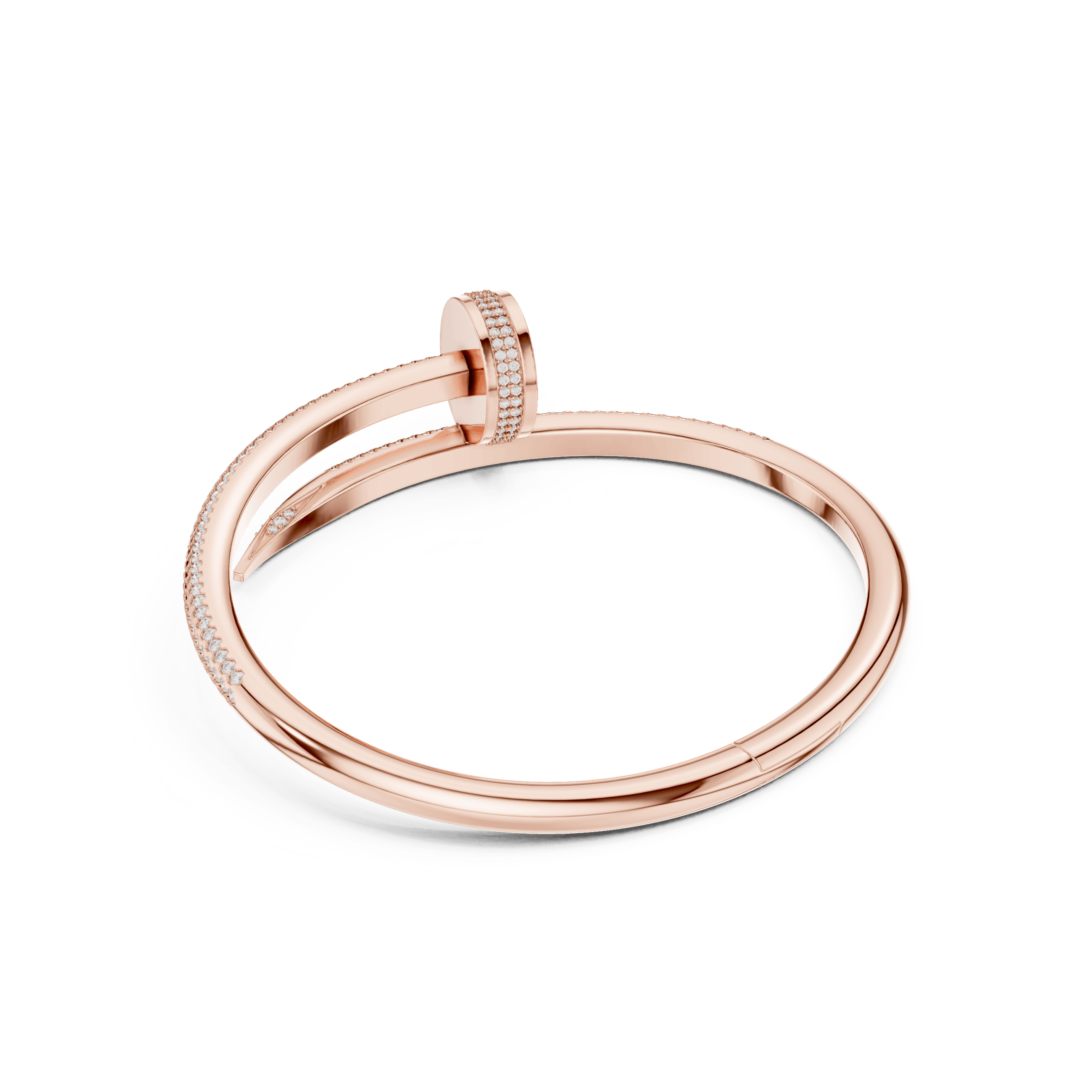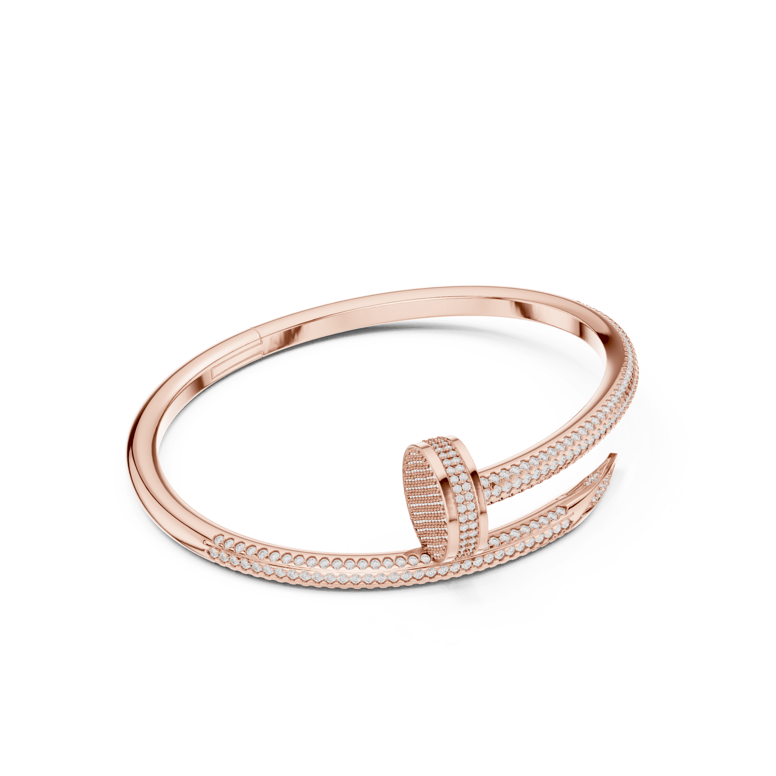 One arm of the bangle is precision-set with a continuous line of pavé stones, while the opposing arm maintains a polished taper for contrast and structural balance. The pavé-set arm exhibits a controlled band width of approximately 4.35 mm, tapering smoothly toward the terminal edge. The vertical rise at the crossover junction is maintained within approximately 4.40 mm, ensuring a low-profile silhouette while preserving dimensional strength.