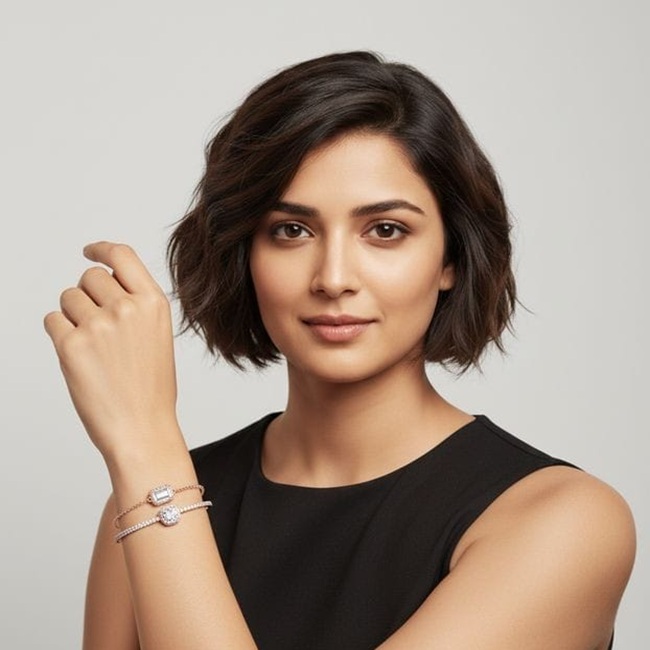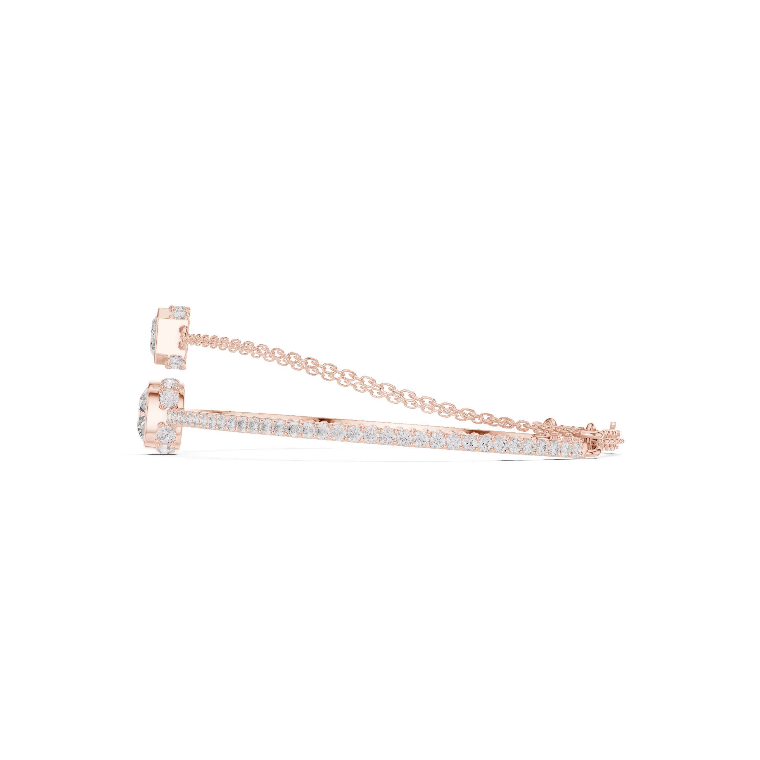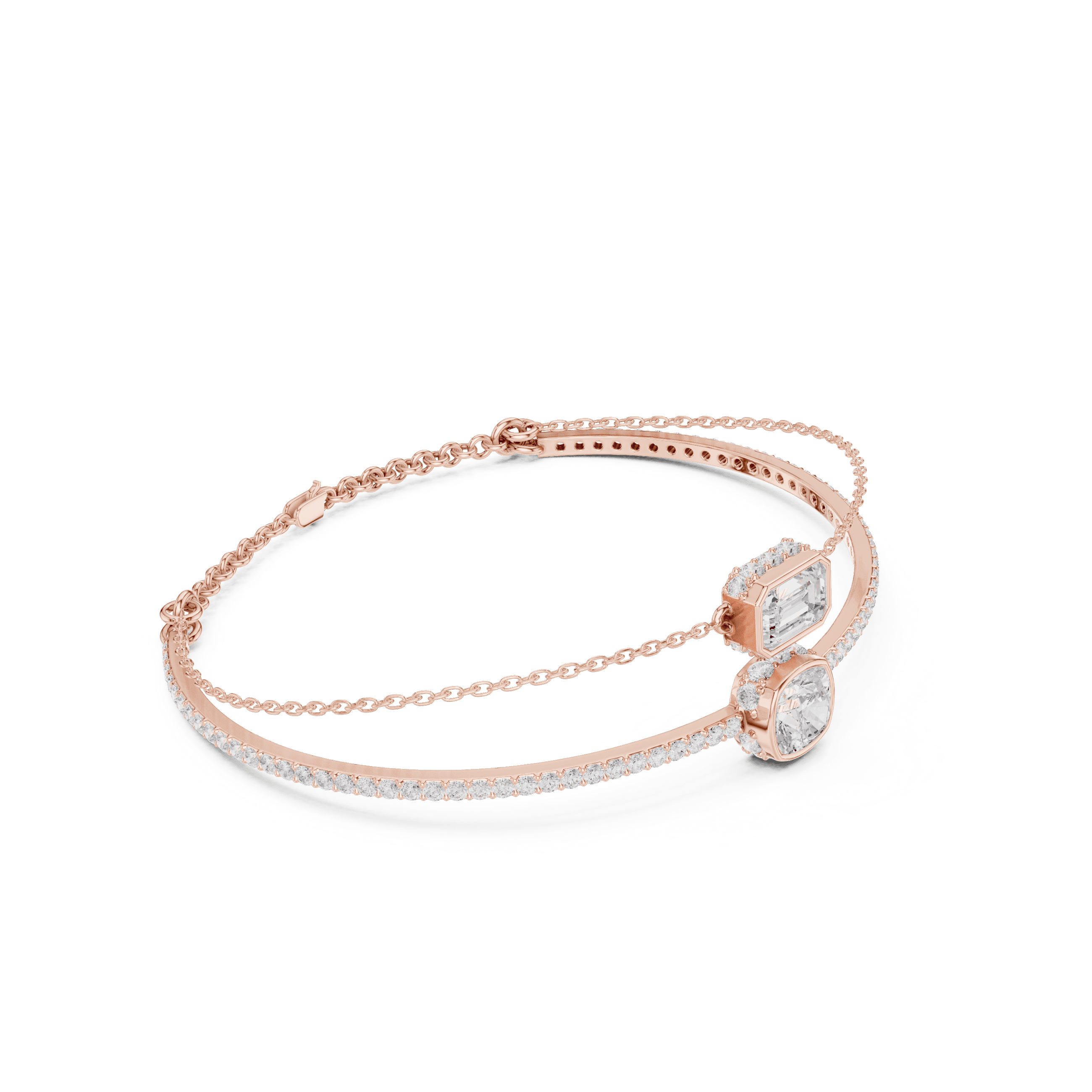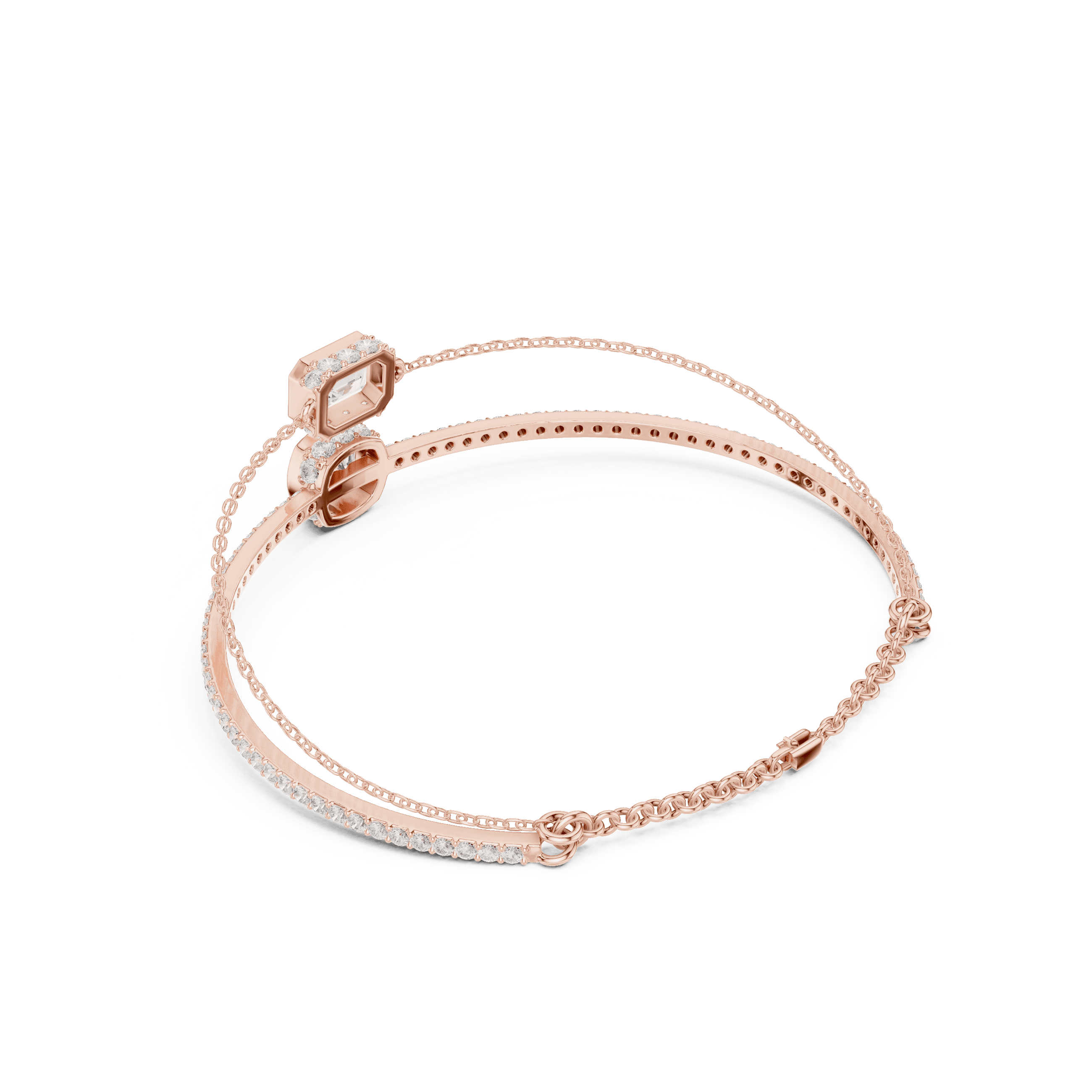 Elystra is crafted in 14K rose gold, weighing approximately 8.6 grams, designed to sit with effortless balance on the wrist. The bracelet features two refined diamond-set forms — one cushion square and one emerald-cut — positioned in perfect harmony and connected through a sleek adjustable chain that moves fluidly with every gesture.