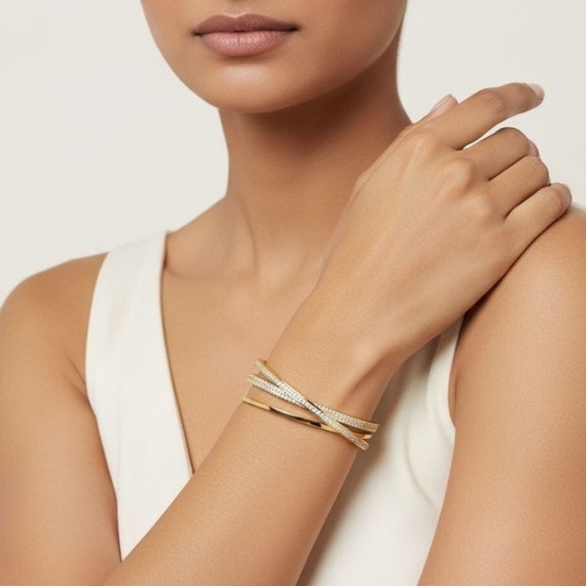 Élan Virelle is a sculptural expression of modern elegance, designed for those who appreciate quiet luxury with a strong point of view. The open cuff silhouette flows in a refined crossover form, creating a sense of movement and balance that feels contemporary yet timeless. Its clean architectural lines are softened by a seamless ribbon of brilliance, making the piece equally powerful worn alone or layered with intention.