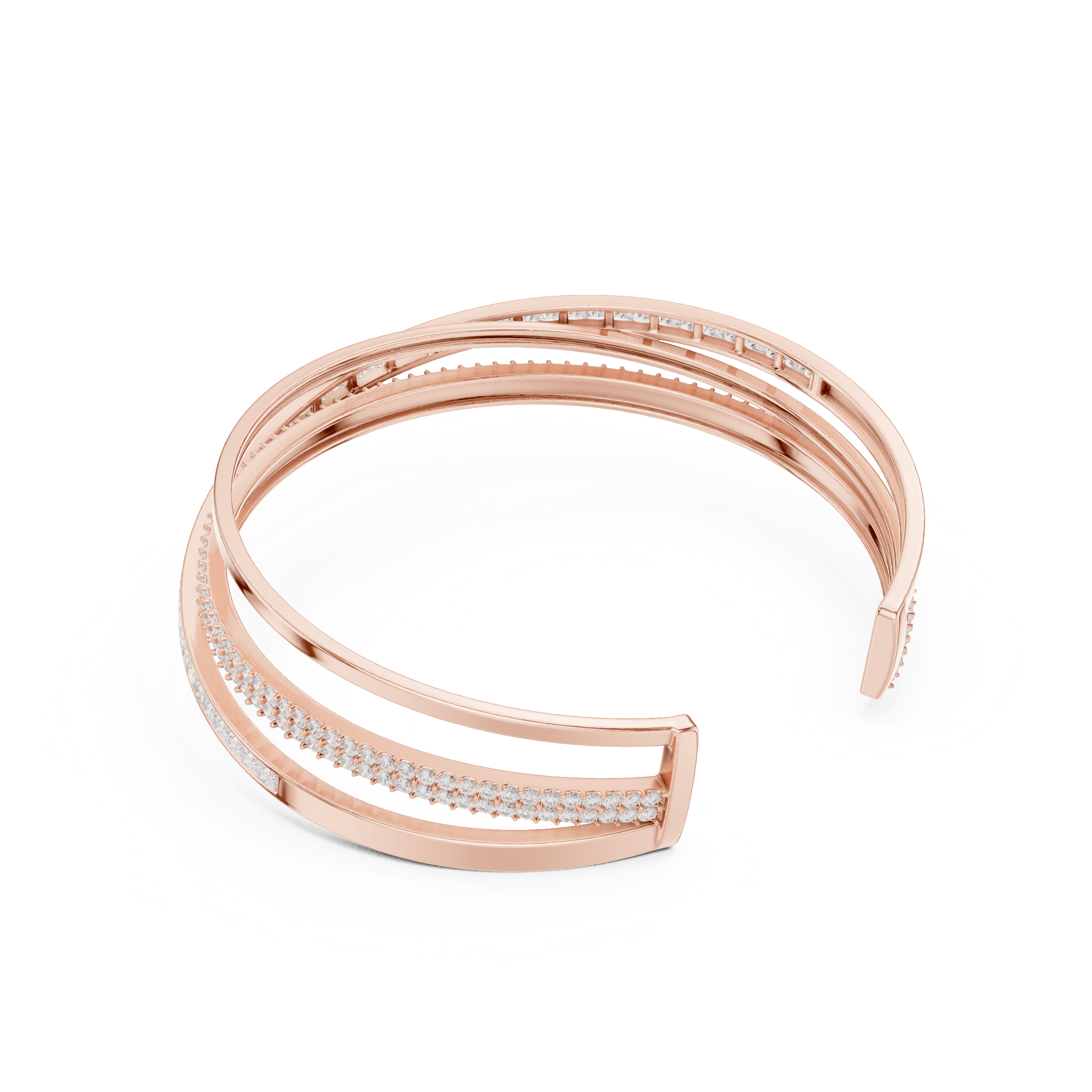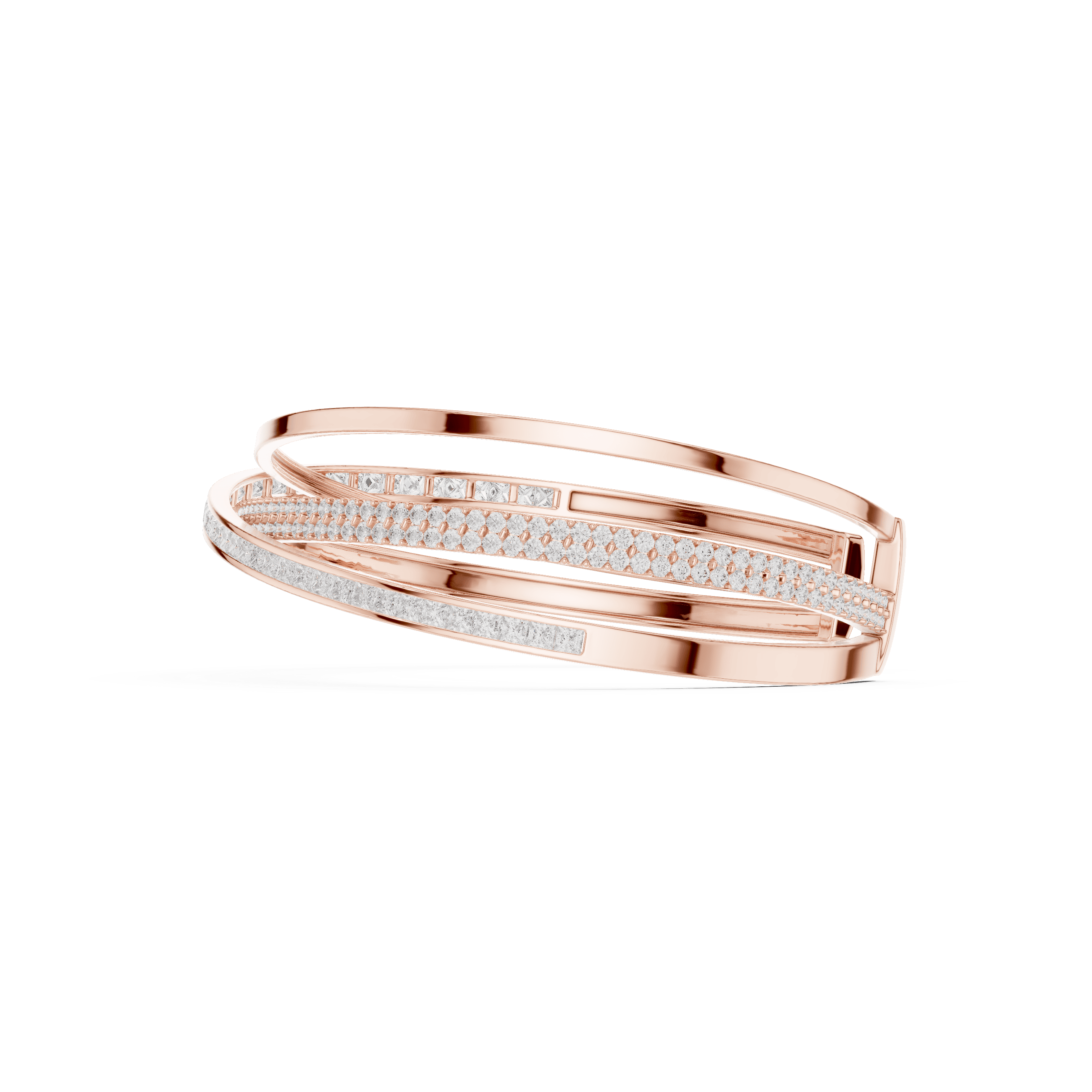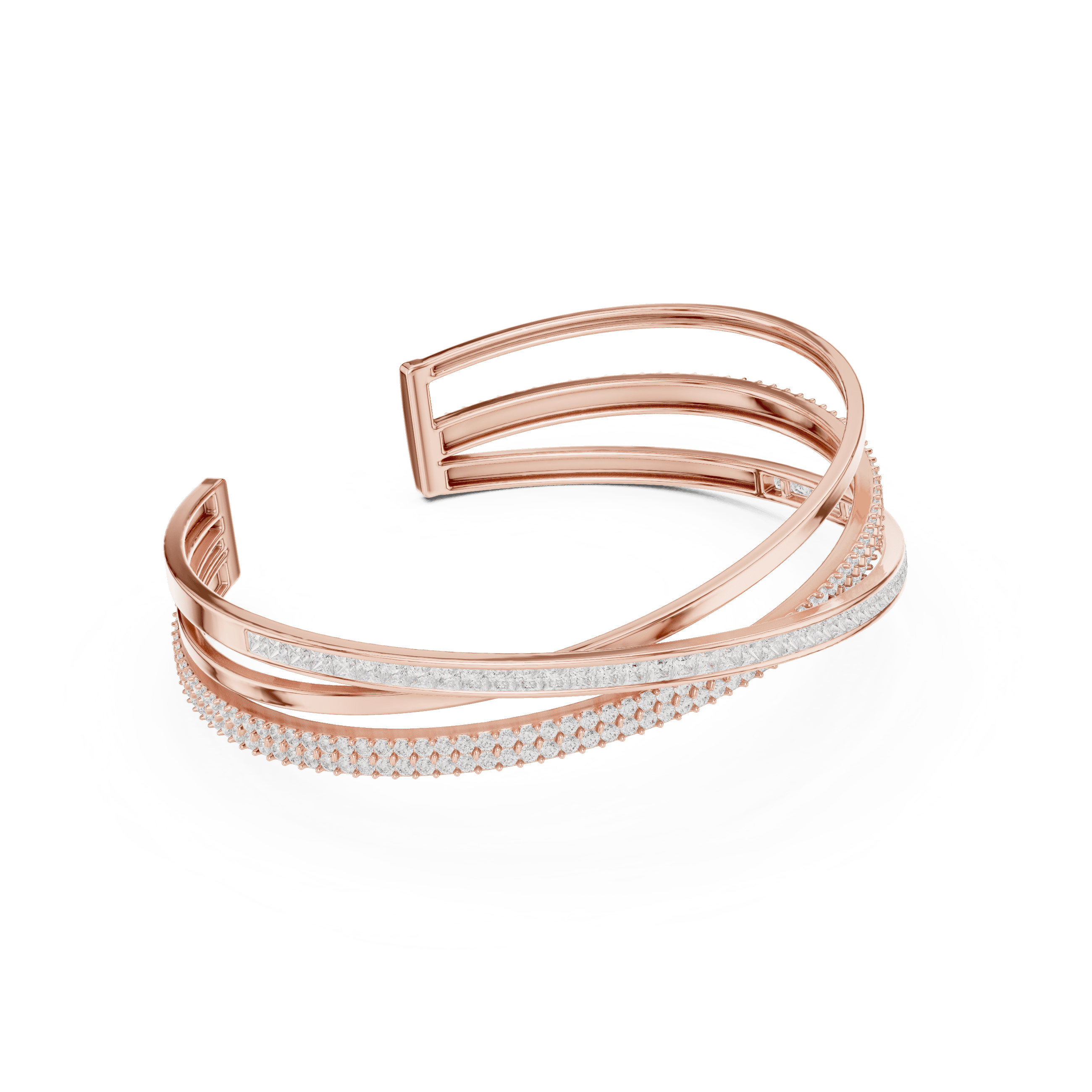 As per the CAD design, this bracelet is adorned exclusively with laboratory grown diamonds, thoughtfully selected and precision set to enhance fluid sparkle across the form. The design features a total of 239 diamonds, including 192 round brilliant laboratory grown diamonds of 1.50 × 1.50 mm and 47 princess-cut laboratory grown diamonds of 2.00 × 2.00 mm. Together, these diamonds create a striking total diamond weight of approximately 4.63 carats, delivering a refined shimmer that feels luminous rather than overpowering. The combination of round and princess cuts adds depth and texture, allowing light to travel effortlessly across the bracelet’s surface.